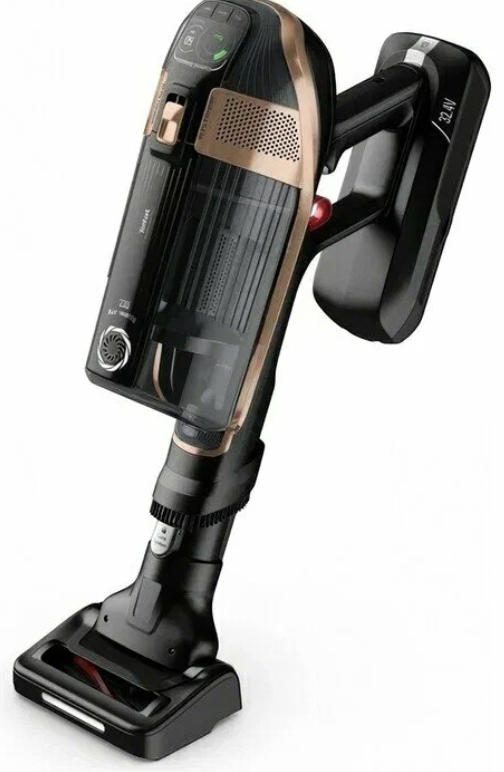 Внешние составляющие: функционал «6в1», вертикальный корпус, сгибающаяся труба Flex Motion, LED-дисплей, насадка для влажной уборки, в комплекте набор дополнительных насадок, напольная подставка-зарядка, контейнер 0,3 л.