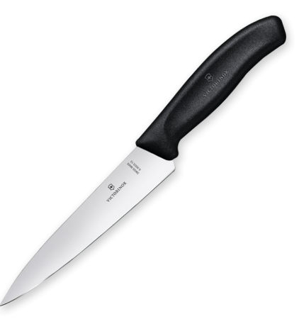 Это тот самый случай, когда не нужно думать. Лезвие с рифлением по бокам: продукты не прилипают при нарезке. Можно кидать в посудомойку, не переживая за рукоять. Сантоку — японская форма ножа, которая одинаково хорошо работает и с овощами, и с мясом, и с рыбой. У Victorinox клинок чуть приподнят к острию, что удобно для шинковки.