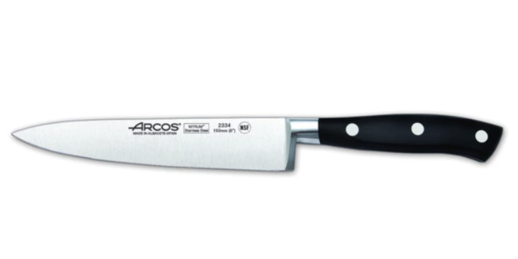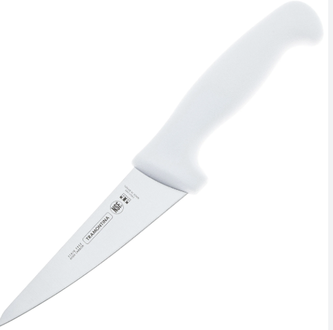 Бразильский шеф-нож из стали 1.4110 (она же DIN 1.4116) с твердостью 56 HRC. Длина клинка варьируется от 175 до 250 мм, средний вес около 195 граммов. Рукоять из черного поликарбоната, форма классическая, именно такой нож представляешь, когда слышишь «шеф-нож».