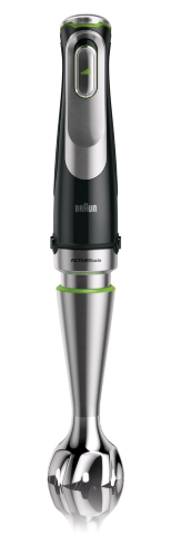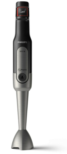 Мощность 800 Вт, всего 2 скорости плюс турбо-режим, система QuattroBlade с четырьмя лезвиями. Лезвия в QuattroBlade заточены под углом и закалены специальным способом, что дает более быстрое измельчение без застревания продуктов. В наборе: стакан 600 мл, венчик, измельчитель 0,5 л и технология AntiSplashing для защиты от брызг. Вес 0,9 кг — самый легкий в этом списке.