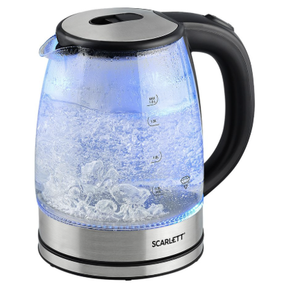 Компактнее предыдущего — объем 1.5 литра. Мощность 1500 Вт, вода нагревается за 6-7 минут на полный чайник. Корпус стеклянный с пластиковыми деталями. Колба из стекла. Весит 1.1 кг. Размеры: 16 × 23 × 22.5 см. Длина шнура — 70 см, короче, чем у Scarlett.