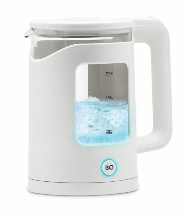 Во время нагрева горит синяя подсветка — никакой практической пользы, просто декор, но смотрится симпатичнее голого пластика. Автоотключение срабатывает надежно. Система безопасности Safe Work: блокировка включения без воды и отключение при снятии с подставки. Крышка открывается широко, внутрь удобно залезать губкой при мытье.